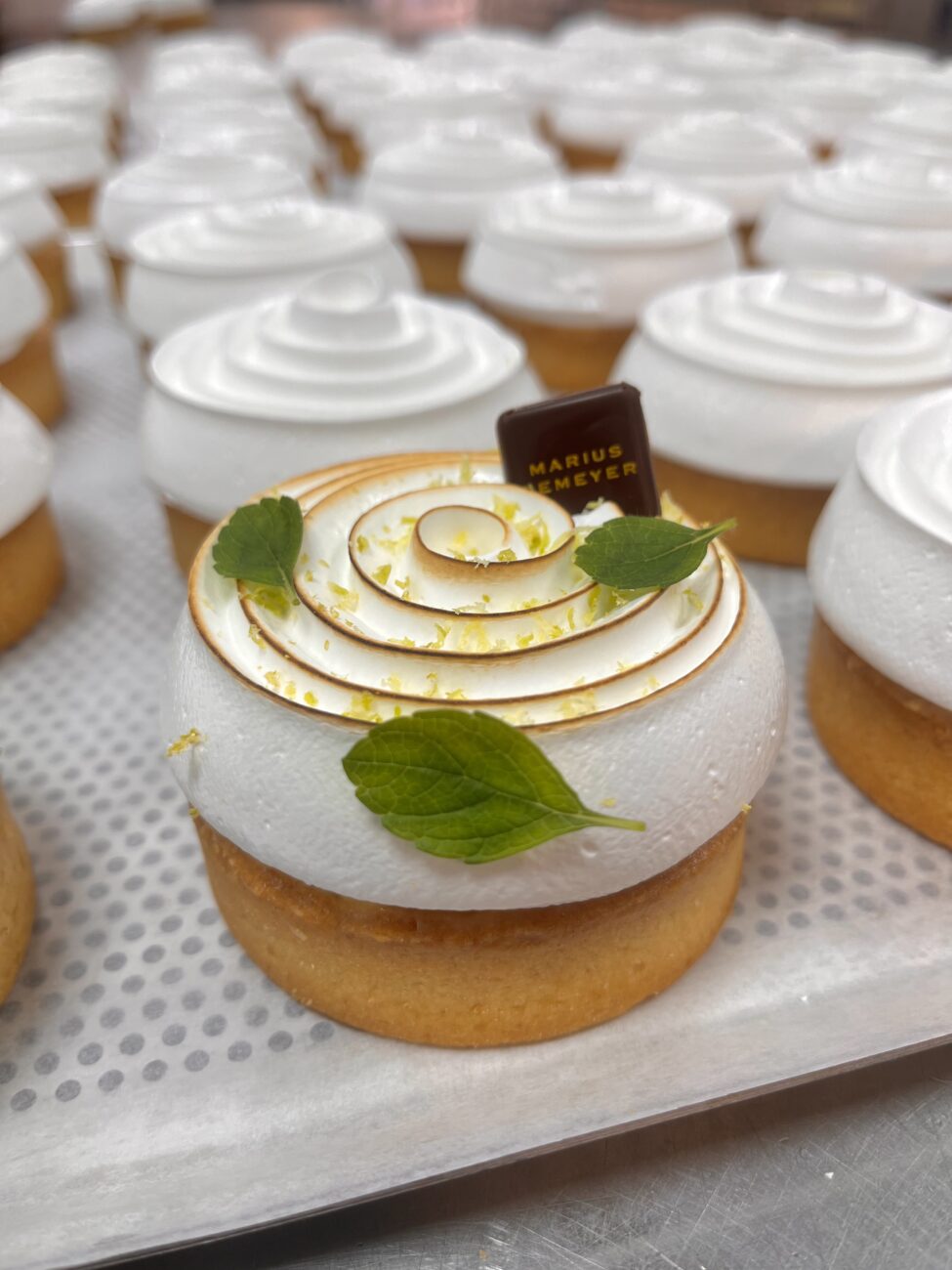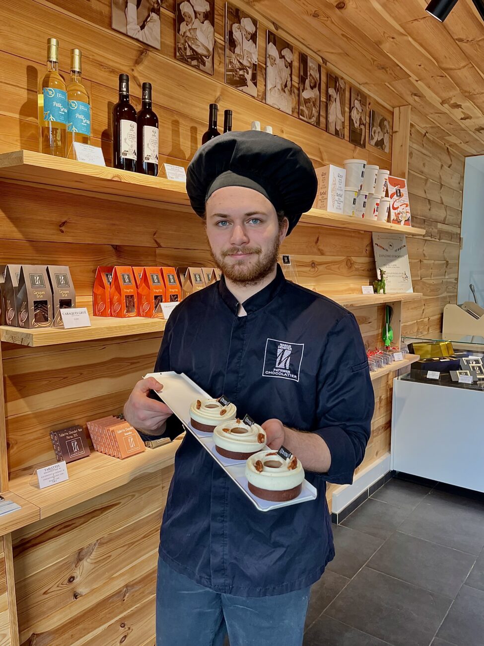 Voici un jeune homme au talent fou ! Marius Demeyer nous a bluffé par la qualité de ses pâtisseries. Belles, mais surtout excellentes. Son nom de famille est bien connu des Montois puisque son grand-père tenait une boulangerie-pâtisserie à Mons dans les années 80, établissement repris par son père quelques années plus tard. Marius a choisi de s’installer un peu à l’extérieur, sur la commune de Ghlin, en 2023. Nous le voyons arriver derrière la verrière qui sépare l’espace vente de l’atelier. Il porte une toque et un doux parfum de chocolat le précède.