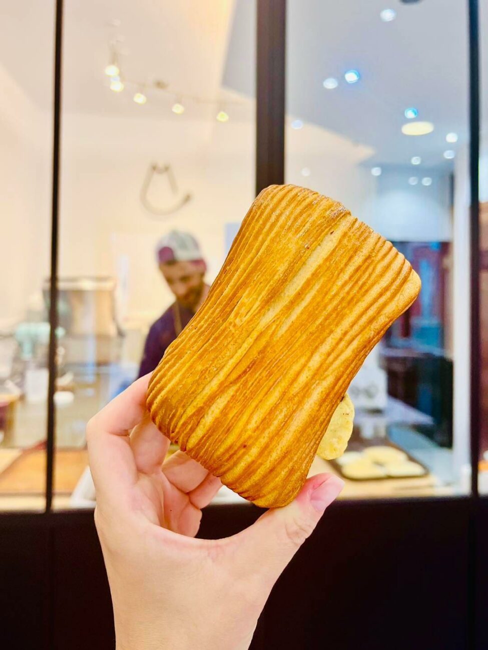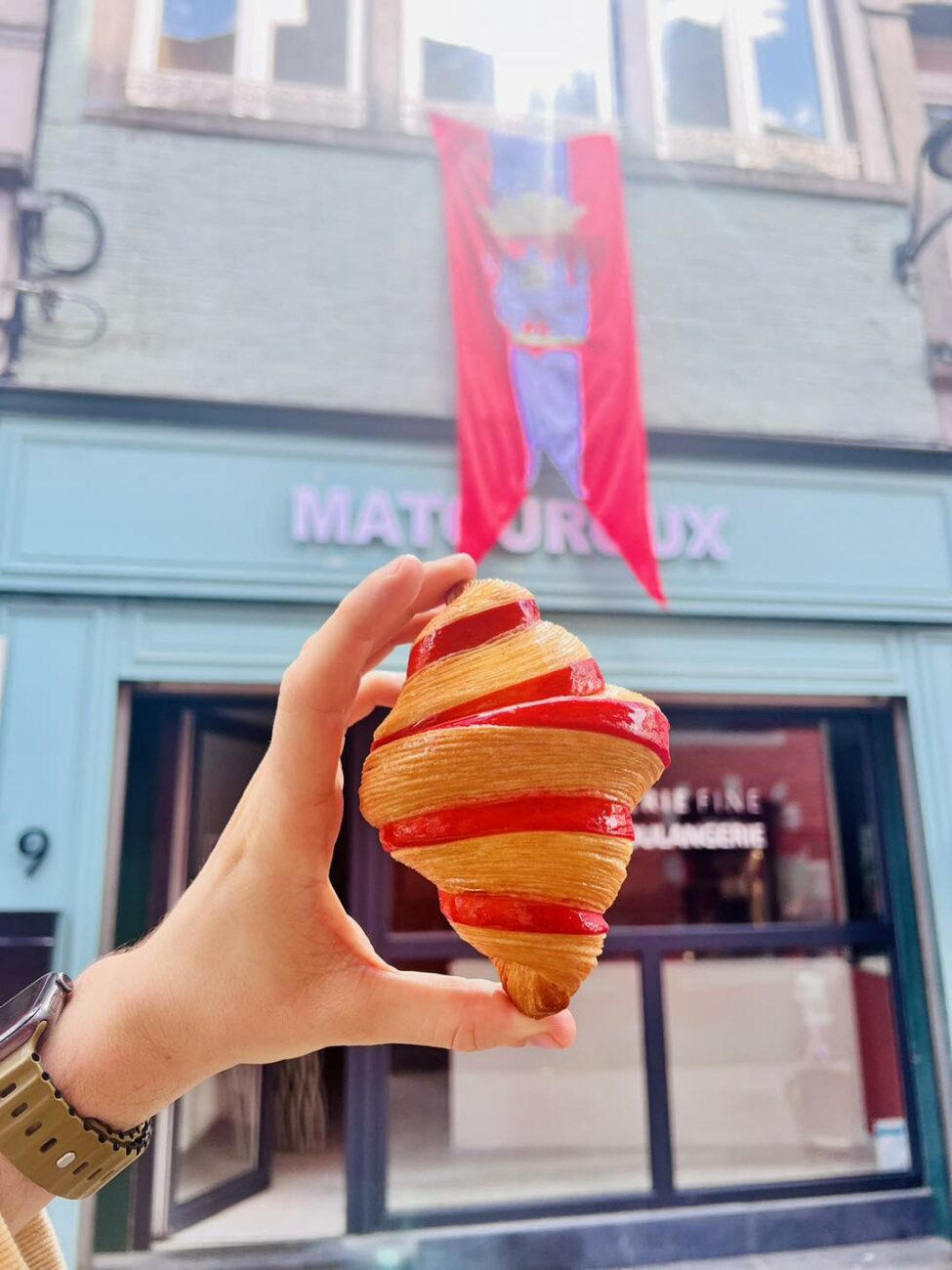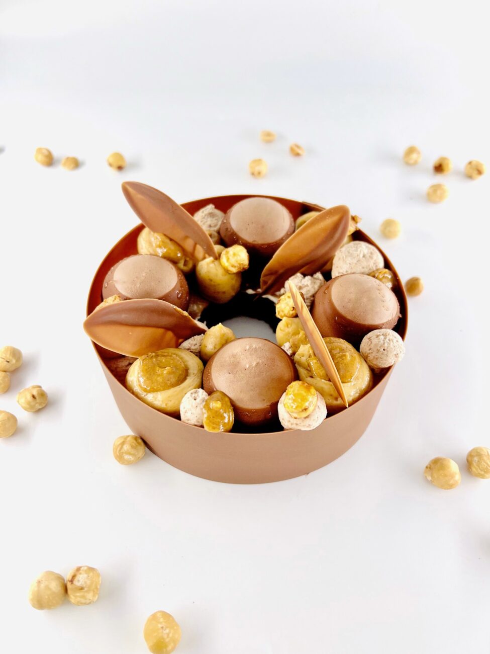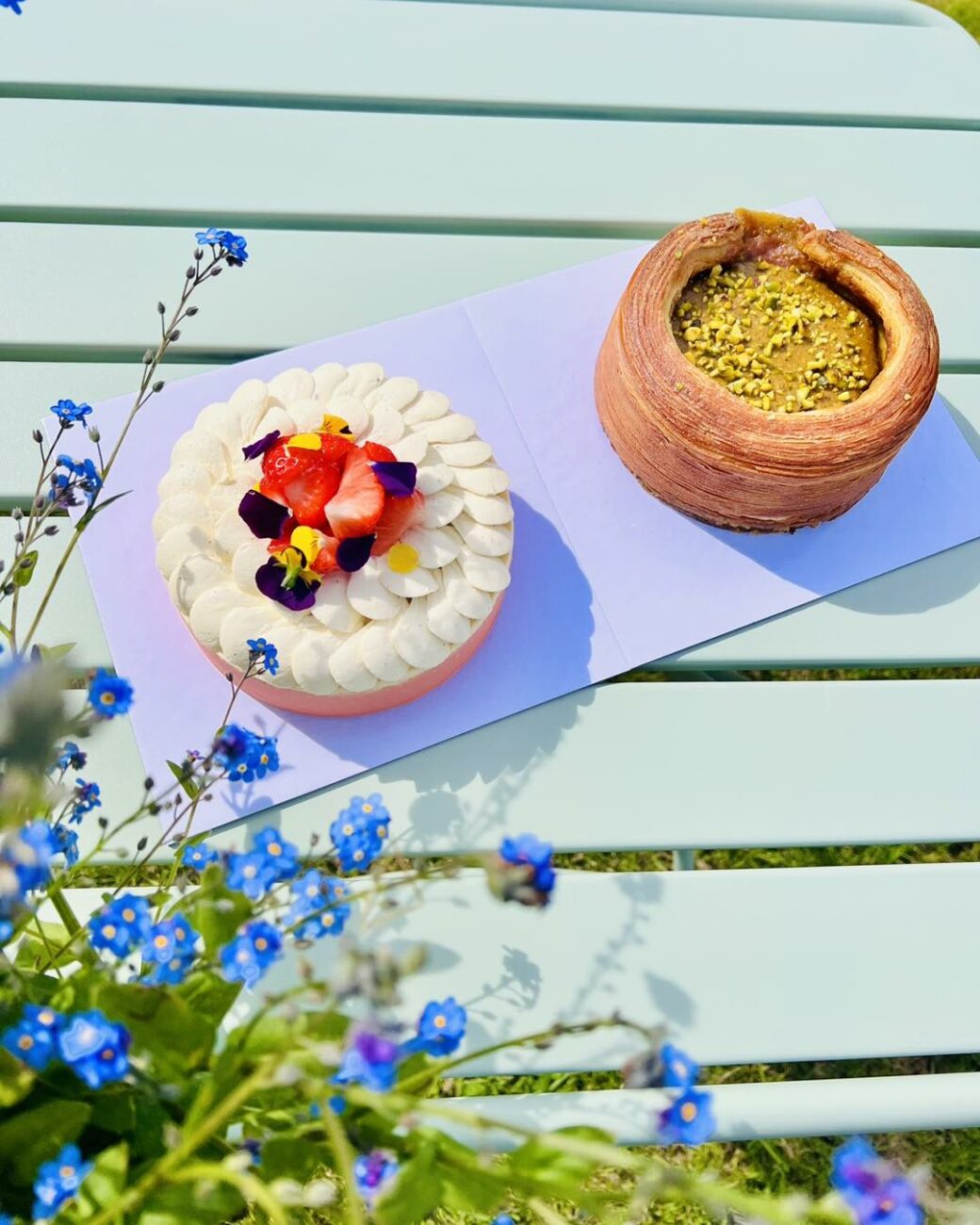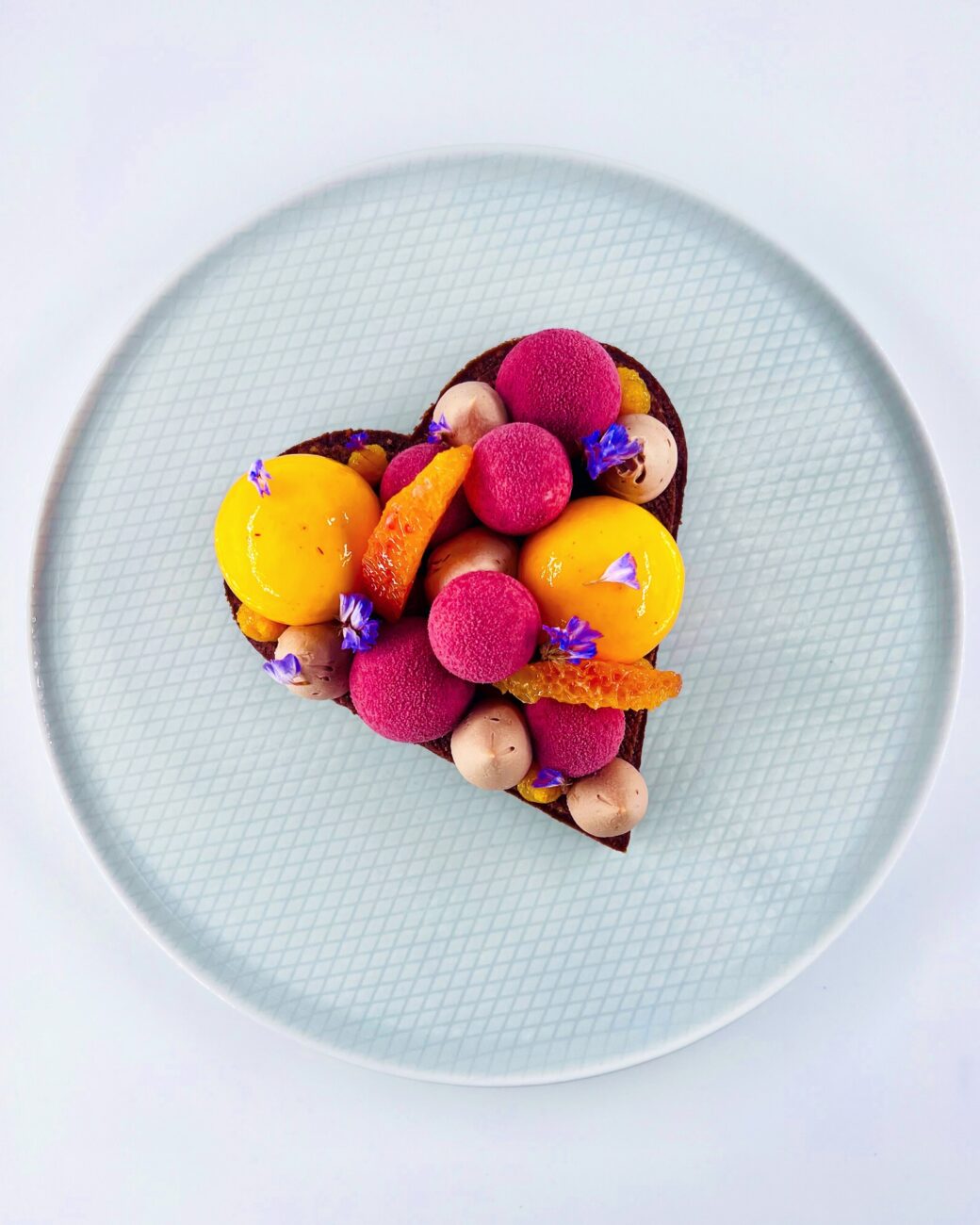 La silhouette d’un chat dont la queue se termine par un fouet pâtissier s’affiche en guise de logo sur la devanture de cette jeune pâtisserie montoise. Ouverte en 2019 par un couple de pâtissiers, Matouroux — (comme un matou roux) — est une petite enseigne spécialisée dans les pâtisseries fines d’inspiration gastronomique. “Notre idée était de transposer le dessert à l’assiette aux pâtisseries de boutique”, explique Melissa Lamberti. Après quelques années dans le monde de la publicité, cette talentueuse jeune femme se reconvertit à la pâtisserie. Elle fonde Matouroux avec son compagnon, Thomas Delabie, chef pâtissier.