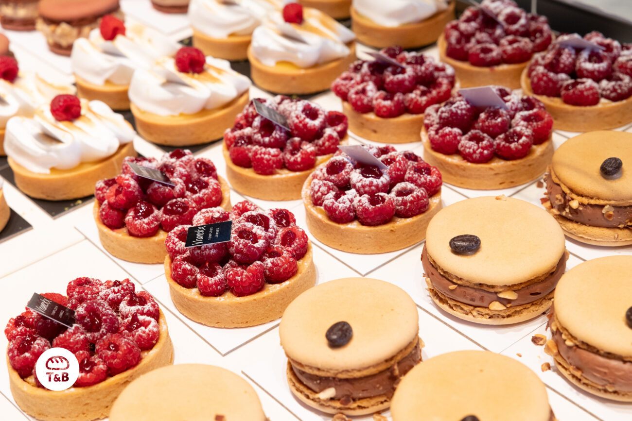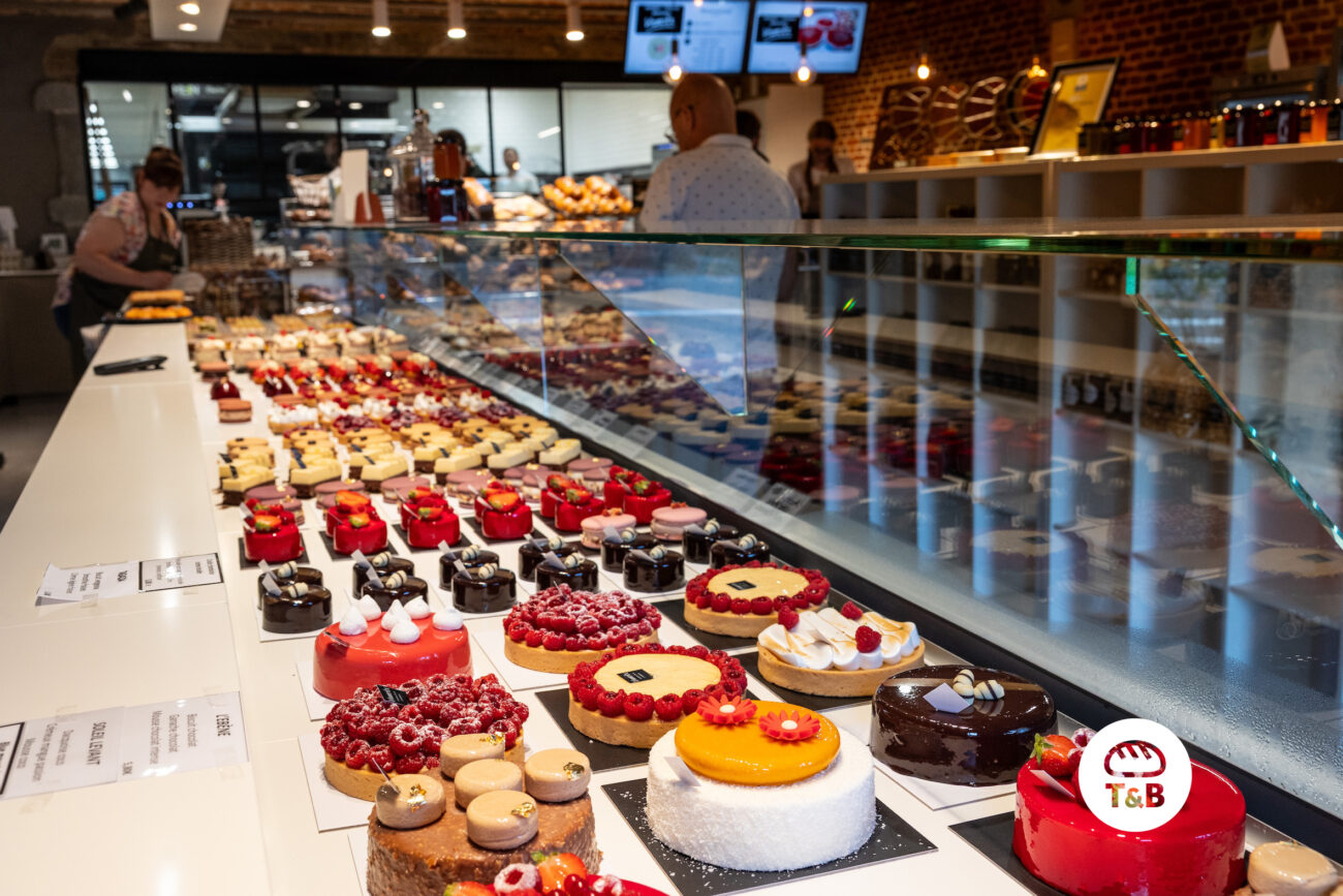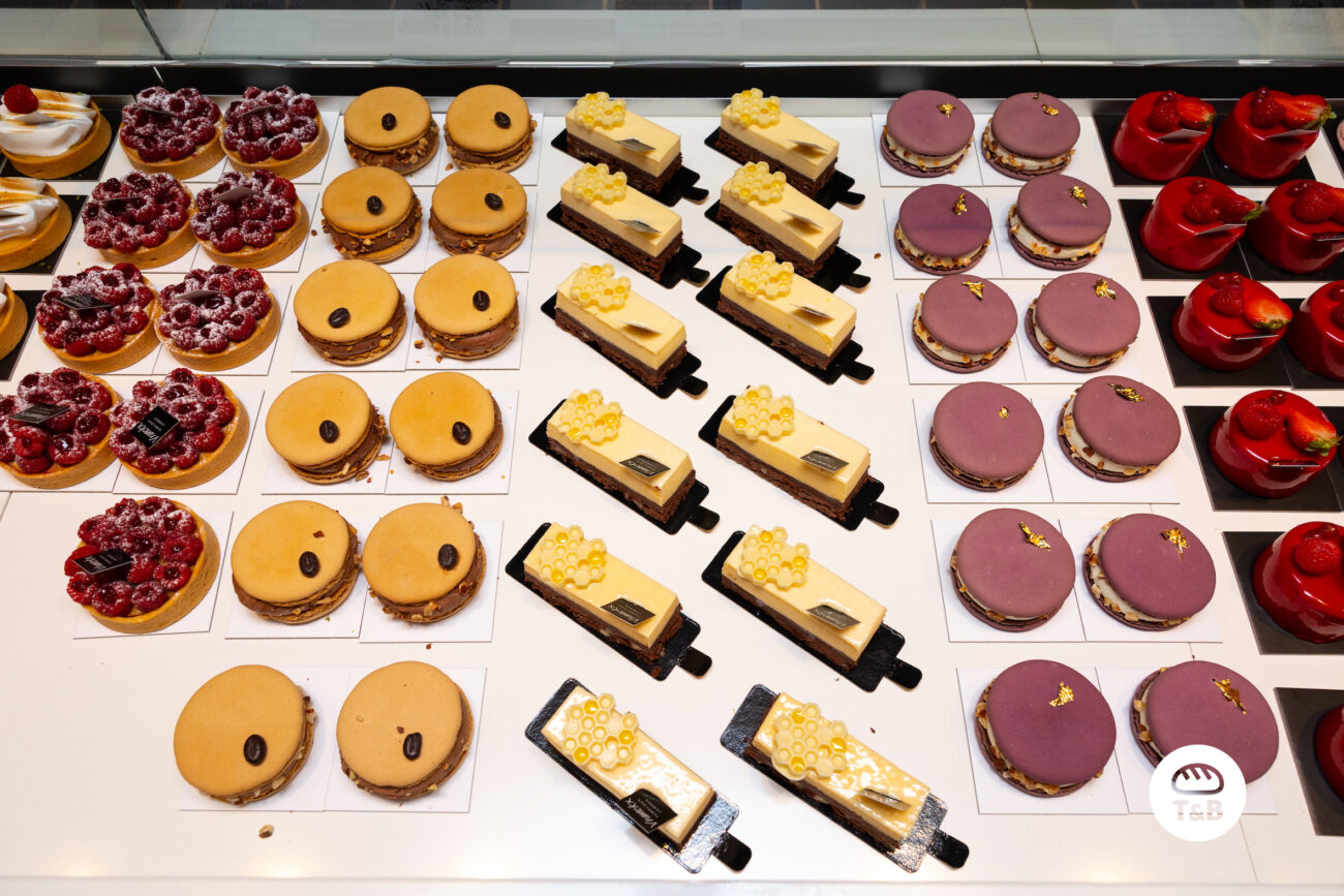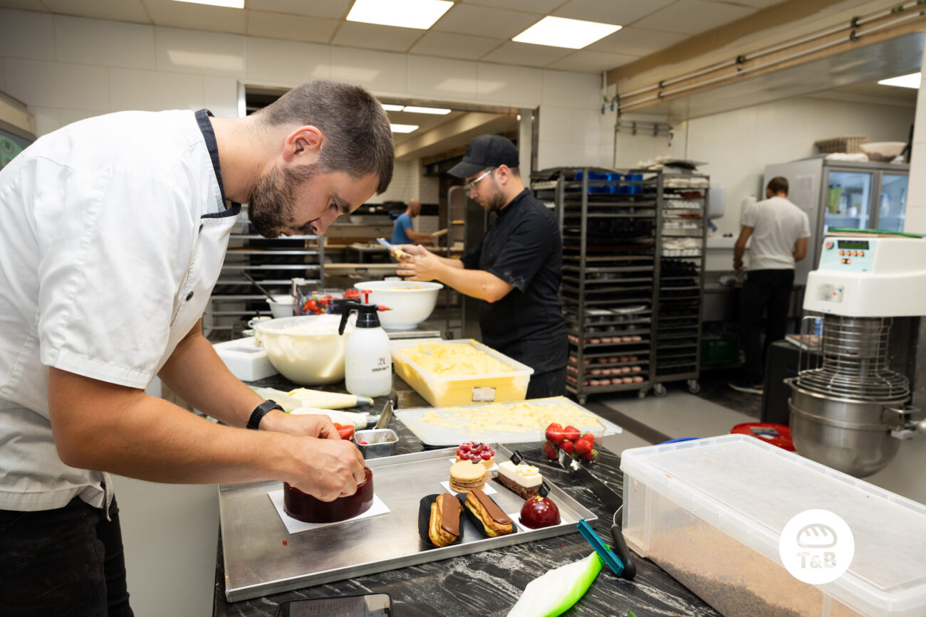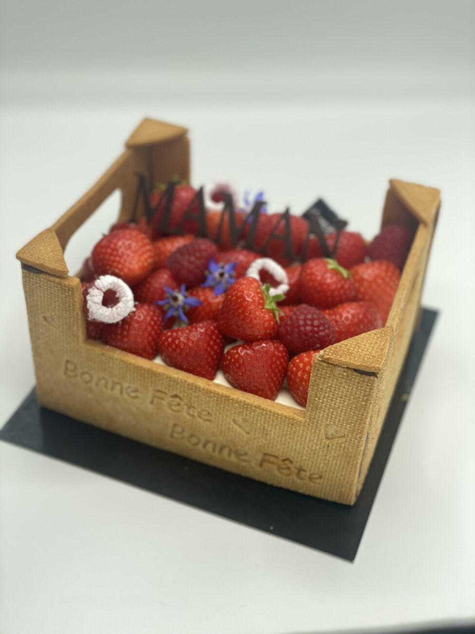 “C’est notre plus grosse vente de l’année”, explique Patrick Vranckx. “L’idée m’est venue en observant les cagettes de fraises livrées par notre fournisseur. » Ce dessert revisite le traditionnel fraisier français sous la forme d’une cagette en biscuit sablé, collée au sucre, garnie d’un lit de biscuit vanillé et d’une crème légère, le tout sublimé par des fraises fraîches. La gamme proposée par la maison comprend quinze à seize sortes de gâteaux individuels. Certains, comme le brownie — testé et approuvé —, restent à la carte en permanence, tandis que les autres se renouvellent tous les mois et demi à deux mois, au gré des inspirations et des saisons.